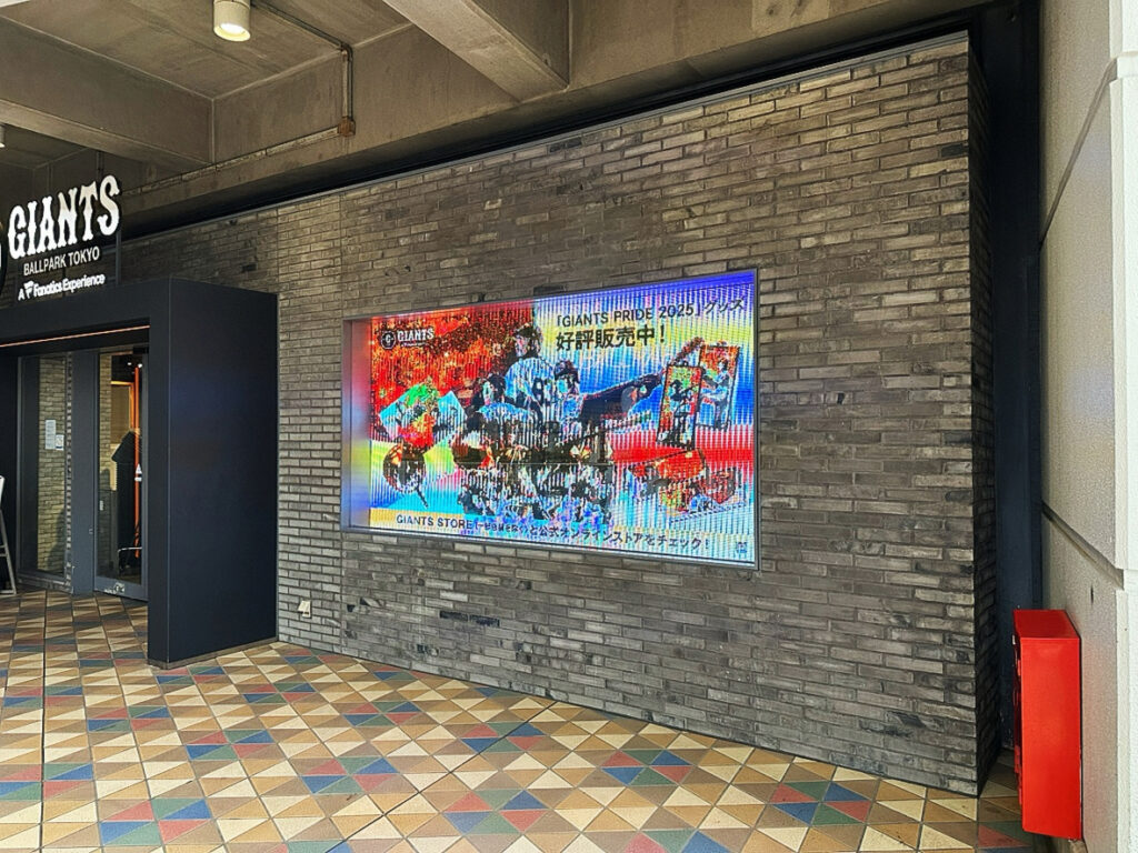 スタジアム来場者を店舗に呼び込むため、ショップ外観のガラス面を活用した新しい集客装置として透過型LEDビジョンを導入。