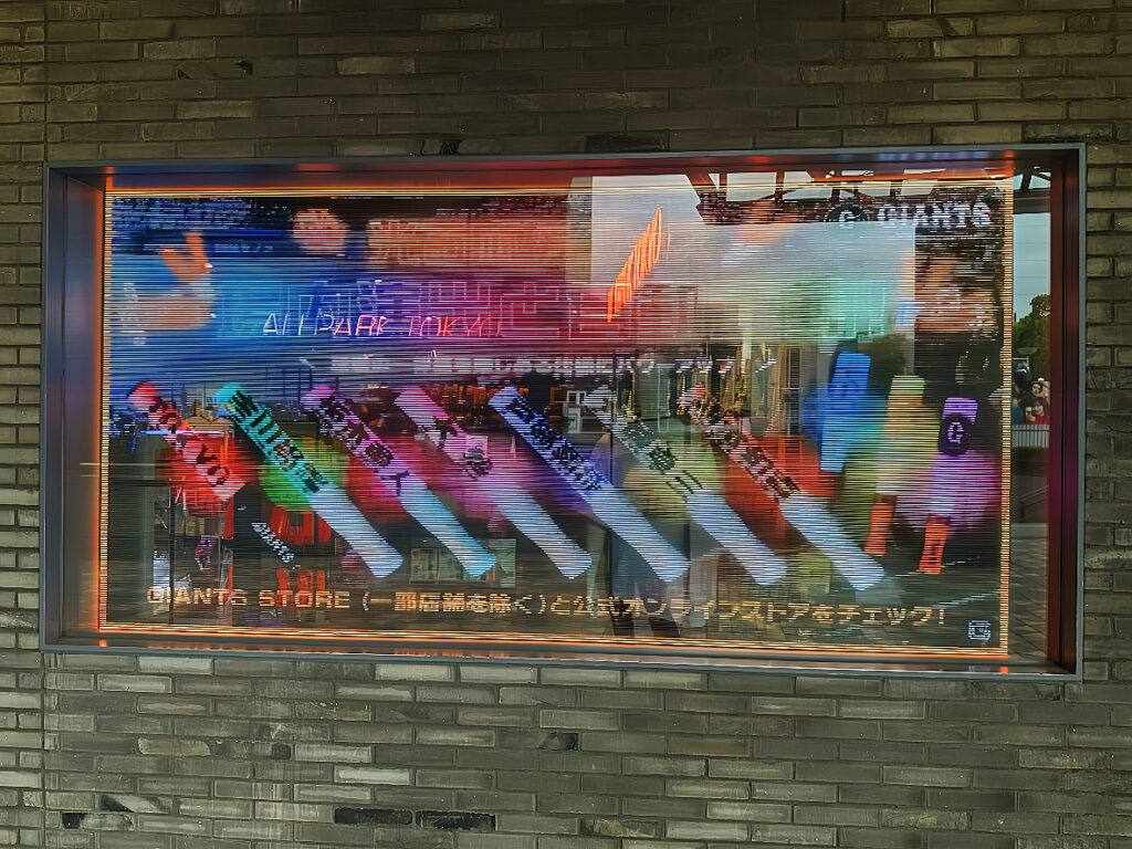 スタジアム来場者を店舗に呼び込むため、ショップ外観のガラス面を活用した新しい集客装置として透過型LEDビジョンを導入。
