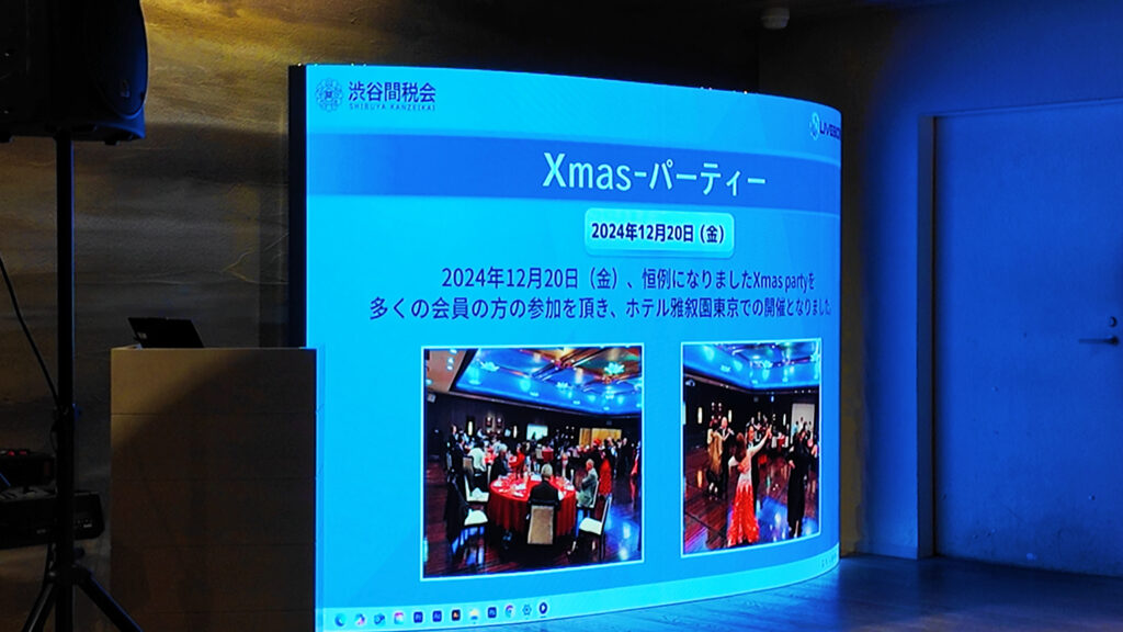 渋谷関税会主催のクリスマスパーティーにおいて、イベント全体の雰囲気づくりと一体感の演出を目的に、LIVESIONのLEDビジョンによる映像演出を導入しました。